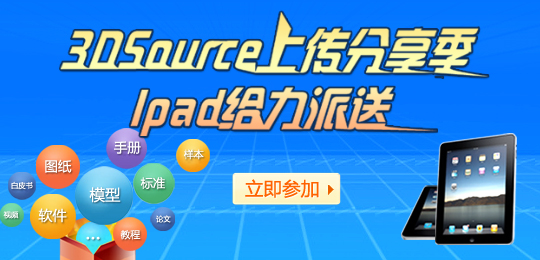 活动内容: 活动期间,3DSource用户登录后,通过 我的3DSource(http://my.3dsource.cn/)页面“我的应用”中上传提交(电子书、网址类、模型库)应用资源并审核通过后,获相应的积分,赢取iPad大奖!* j \6 V( z: ^3 F: N9 A) c' g: R