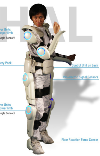 HAL-5是一款可以穿在身上的机器人,高1600毫米,重23公斤,利用充电电池(交流电100V)驱动,工作时间可达到近2小时40分钟。HAL-5可以帮助佩戴者完成站立、步行、攀爬、抓握、举重物等动作,日常生活中的一切活动几乎都可以借助HAL-5完成。HAL-5装有混合控制系统,无论是室内还是户外均有不错表现。, U) y- ?, T) H, d& @6 N