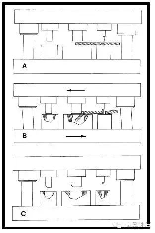 % b' b+ B/ N, s Q 位置不正确的材料也会造成冲裁力的不均衡,如图9所示。错位的材料头进入冲裁刀口之间(A),冲裁时,材料头进入刀口导致模具受力不均匀产生错位(B),由于冲裁间隙很小,错位会导致冲头与刀口发生碰撞,从而损坏。(C)http://mmbiz.qpic.cn/mmbiz/bicViaOy3TwDaiayouWzA3obyfSyrYx6Un8l11lgiaxKrh6nbM2055x2w9jmKfgb17FghNXhtTn7YCr7sAGDF0bOSw/0?wx_fmt=jpeg