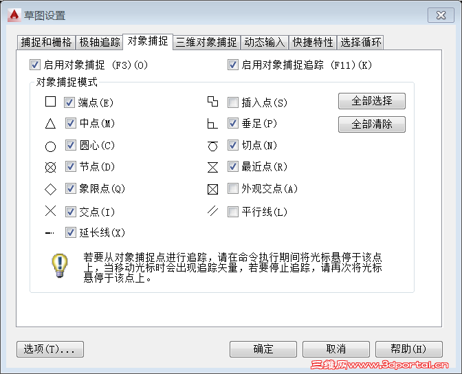 今日问答: AutoCAD作图时,常需要启用对象捕捉及启用对象捕捉追踪。 使用鼠标右键点击CAD图的下方“对象捕捉”/设置,就可以勾选对象捕捉模式。 你常选择哪几种? 1、端点、中点、圆心、交点、垂足; 2、习惯采用Shift+鼠标右键来打开菜单进行选择; 3、其它。